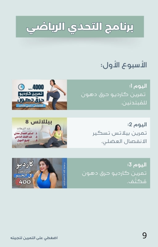هل تبحثين عن برنامج رياضي منزلي يساعدك على حرق الدهون بسرعة وبناء جسم قوي ومتناسق؟ هذا الكتاب الإلكتروني هو كل ما تحتاجينه! صُمم خصيصًا لمحبي اللياقة والباحثين عن طريقة ممتعة وفعالة لتحسين اللياقة البدنية دون الحاجة لصالة رياضية.
